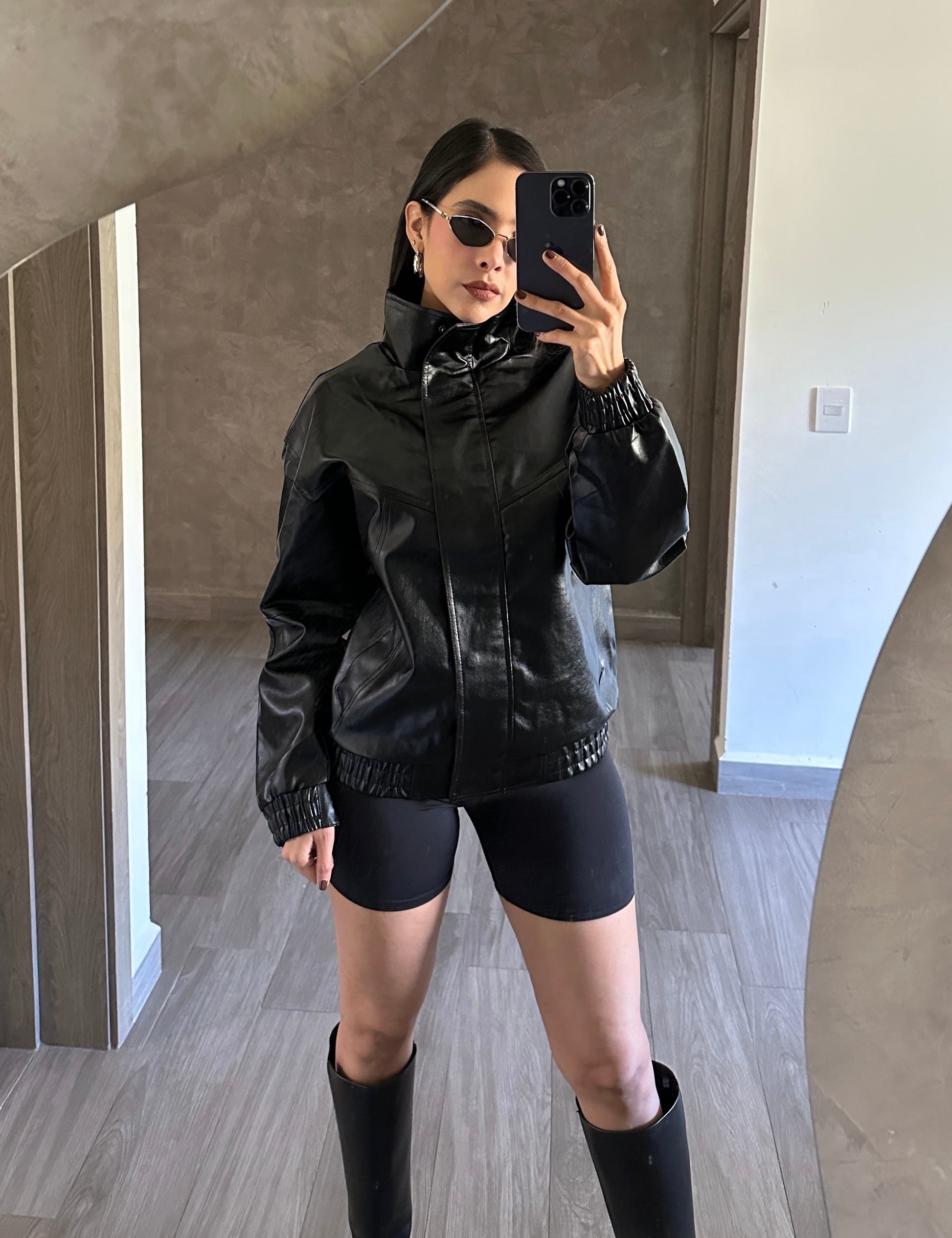 Chamarra color negro de poli piel tipo bomber.