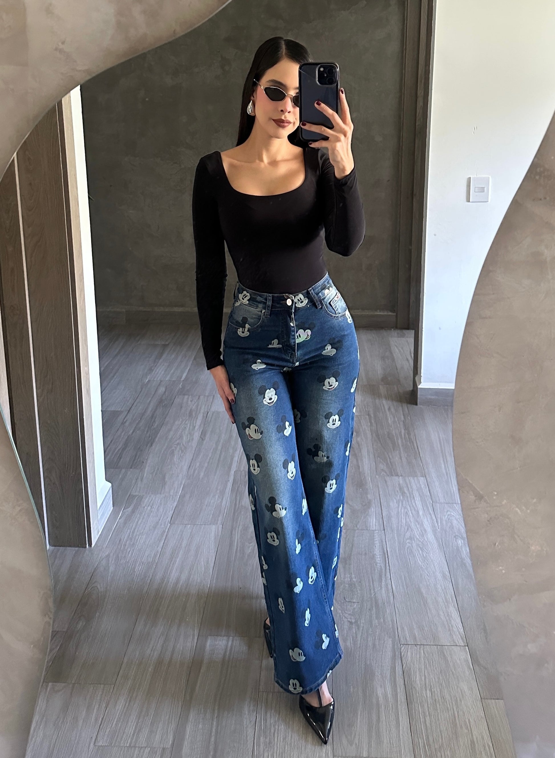 Mickey Mouse jeans crafted from high-quality stretch denim offer all-day comfort and freedom of movement. Designed with an iconic Mickey Mouse print, they add a touch of personality and character to your wardrobe. The stretch fabric adapts perfectly to your body, providing a flattering fit without compromising durability. Ideal for creating versatile casual looks that blend nostalgia with contemporary style. A must-have basic that transcends trends and becomes a key piece in your denim collection.
