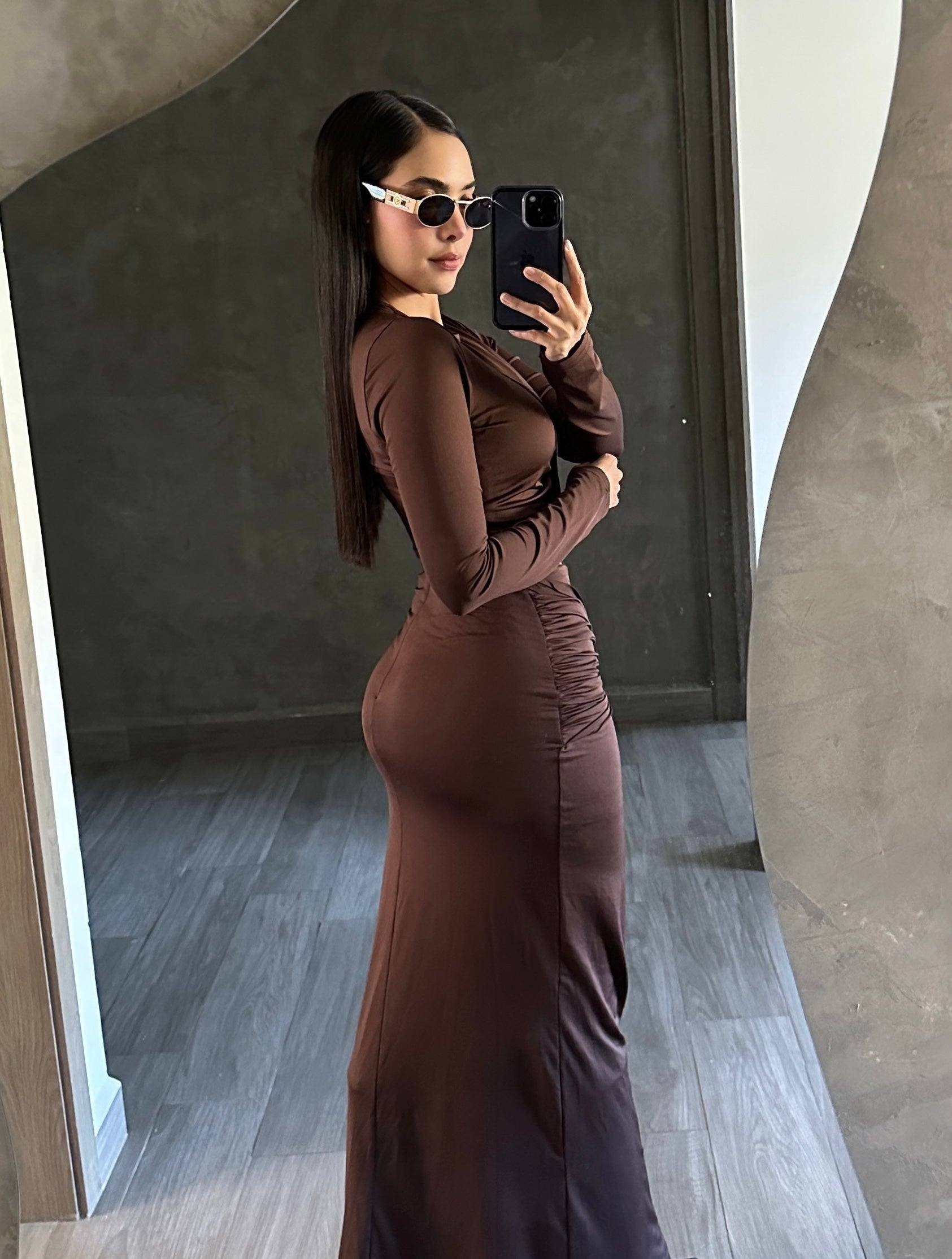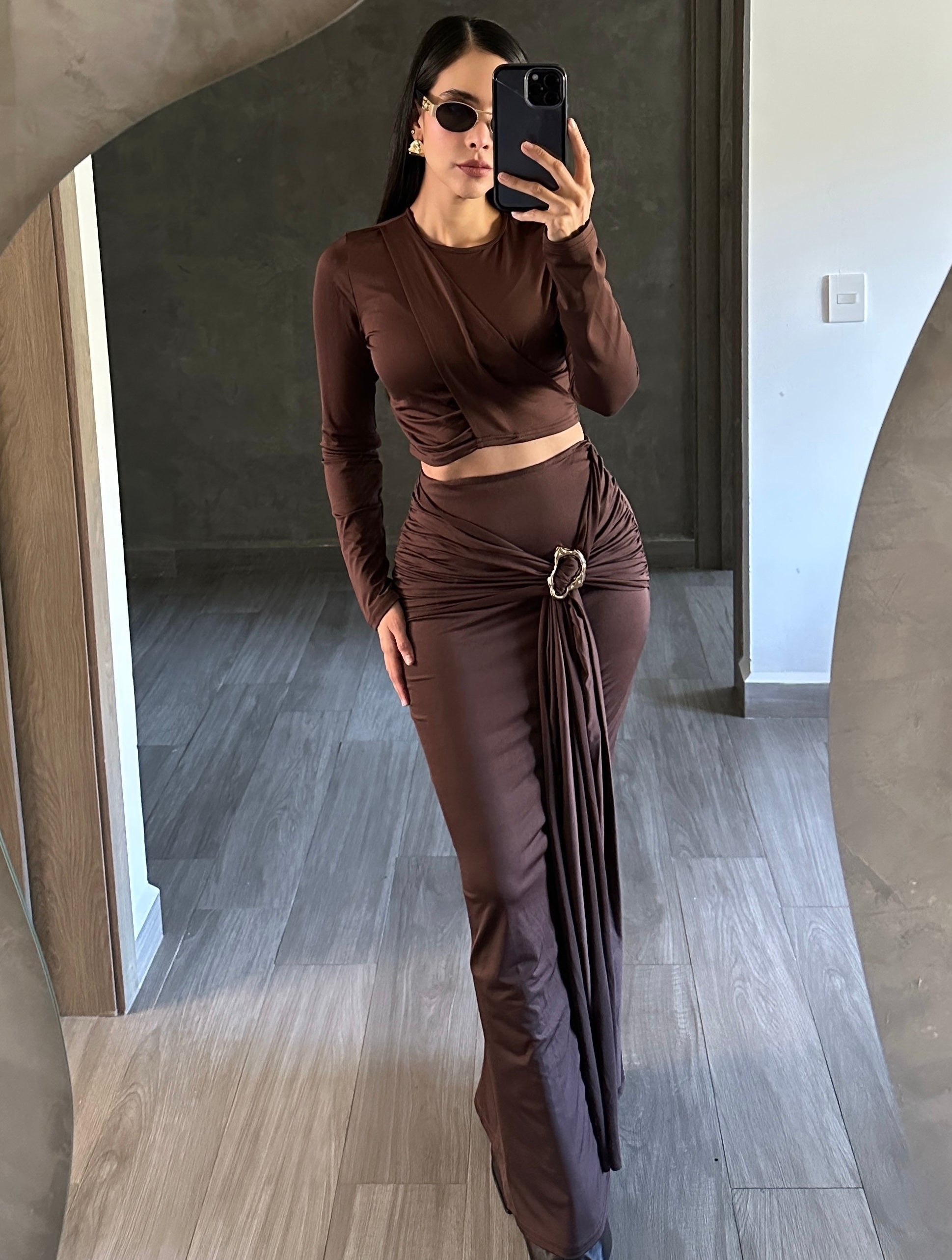 Set café blusa manga larga y falda con broche dorado.