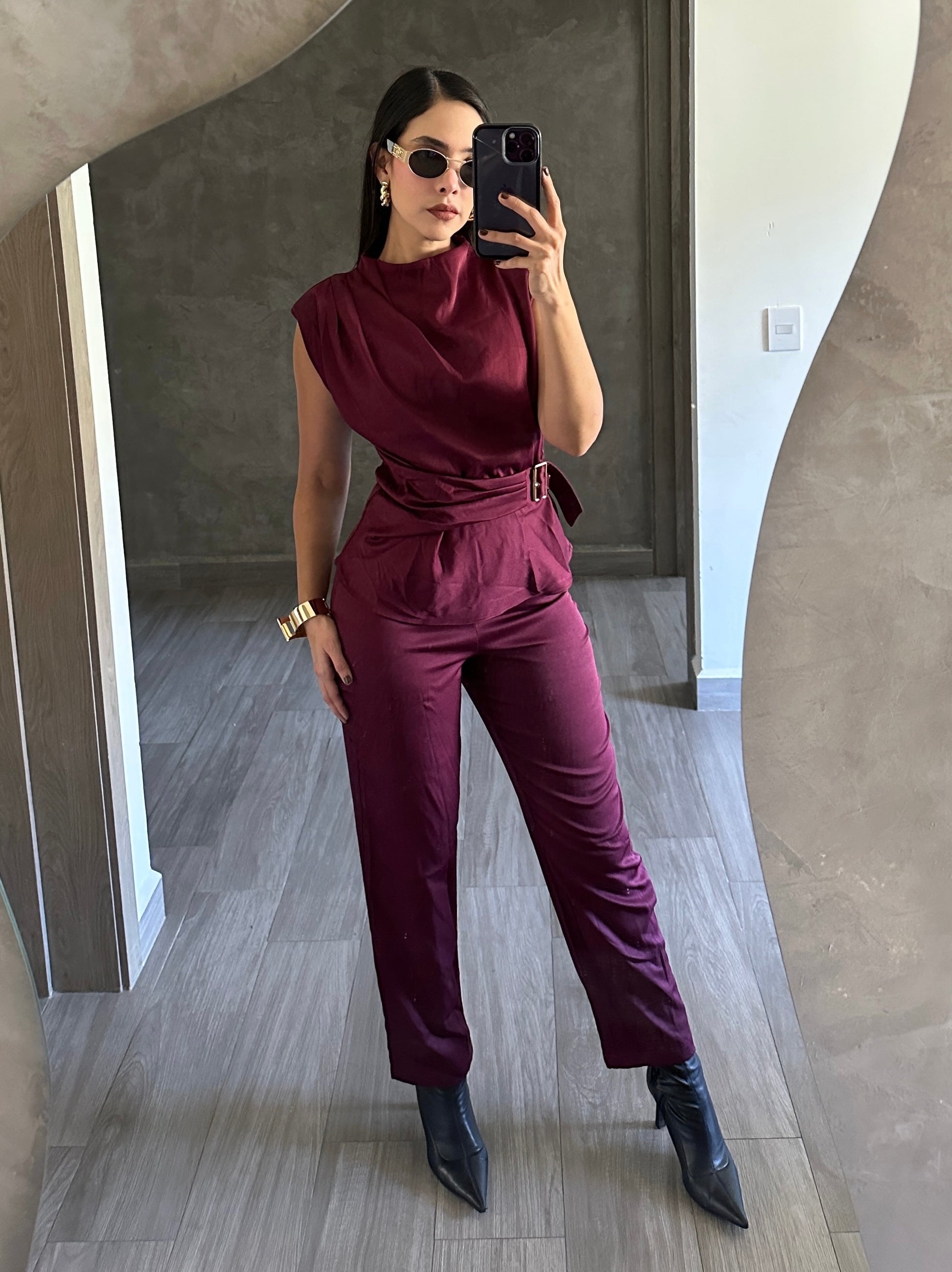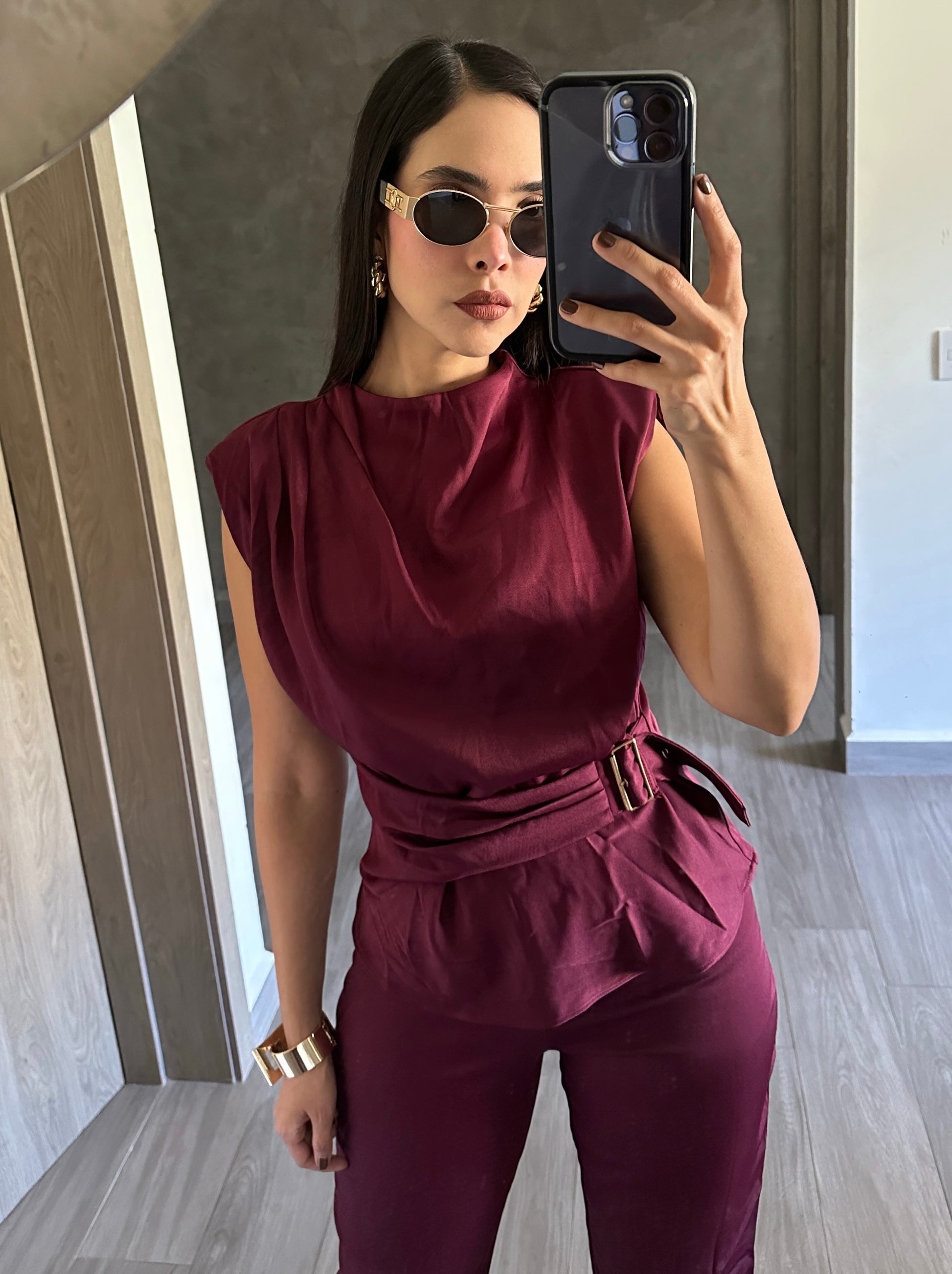 Set tinto de blusa y pantalón con detalle de fajo en la cintura.