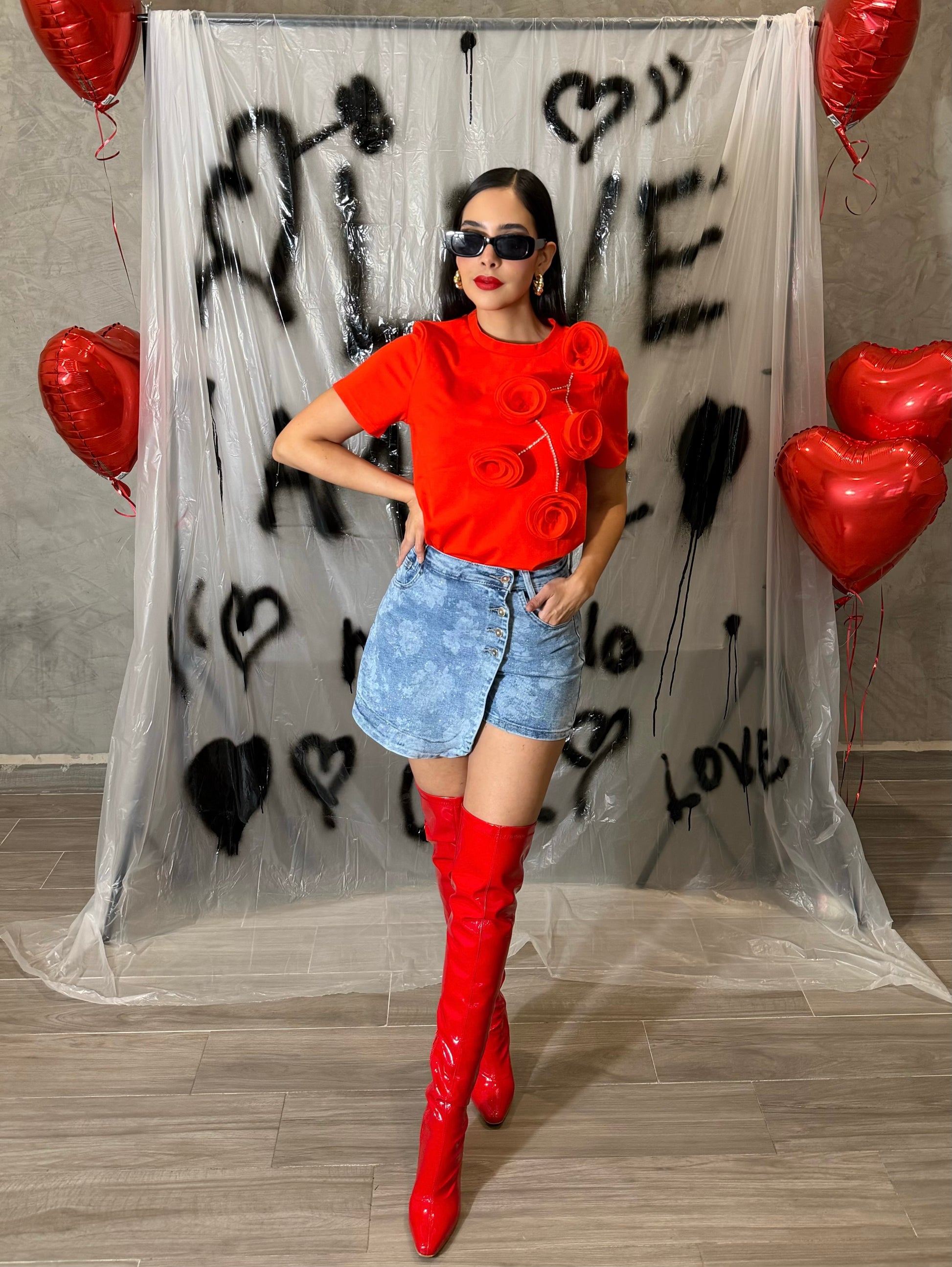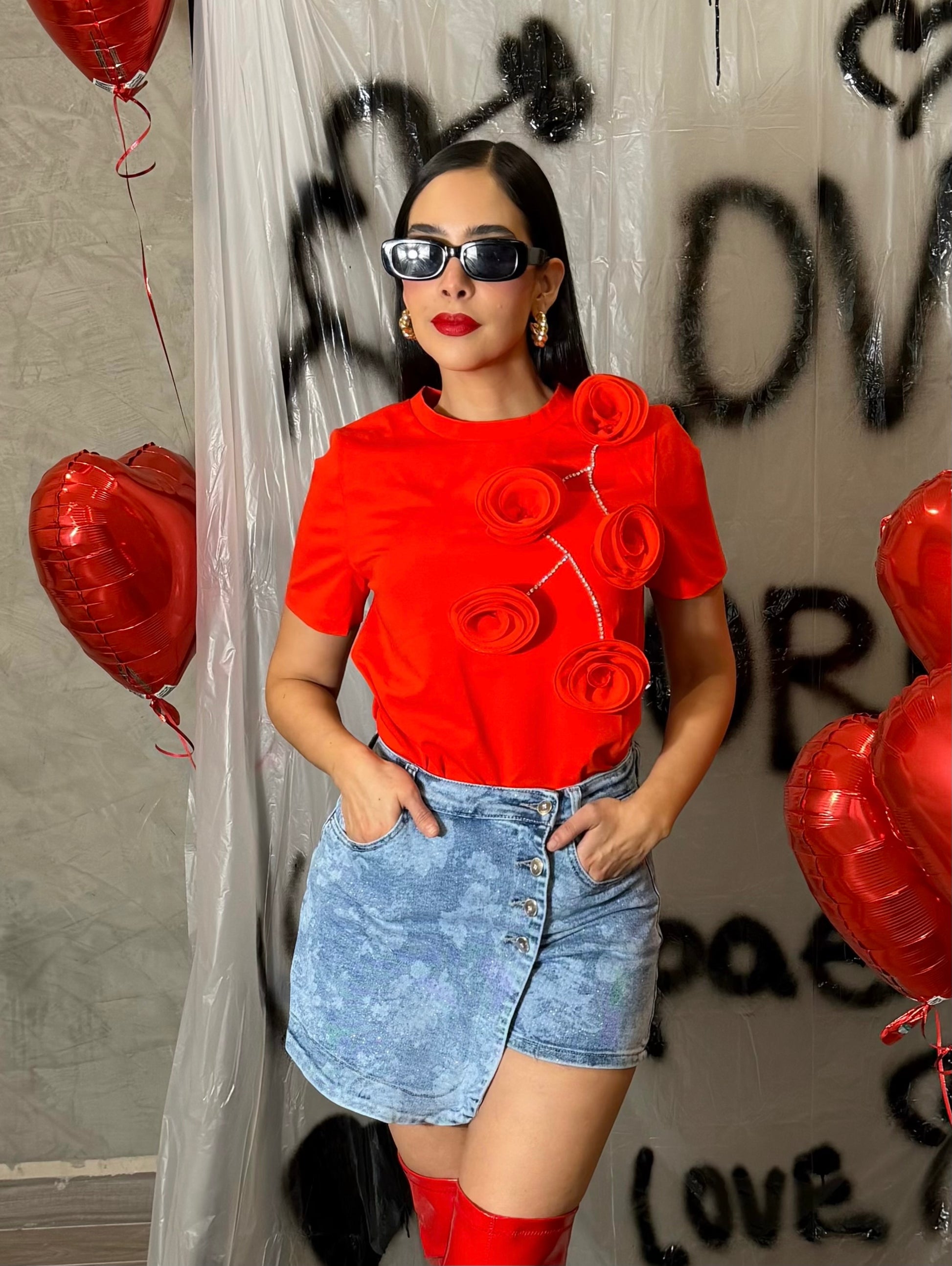 Falda short de mezclilla strech estampado flores.