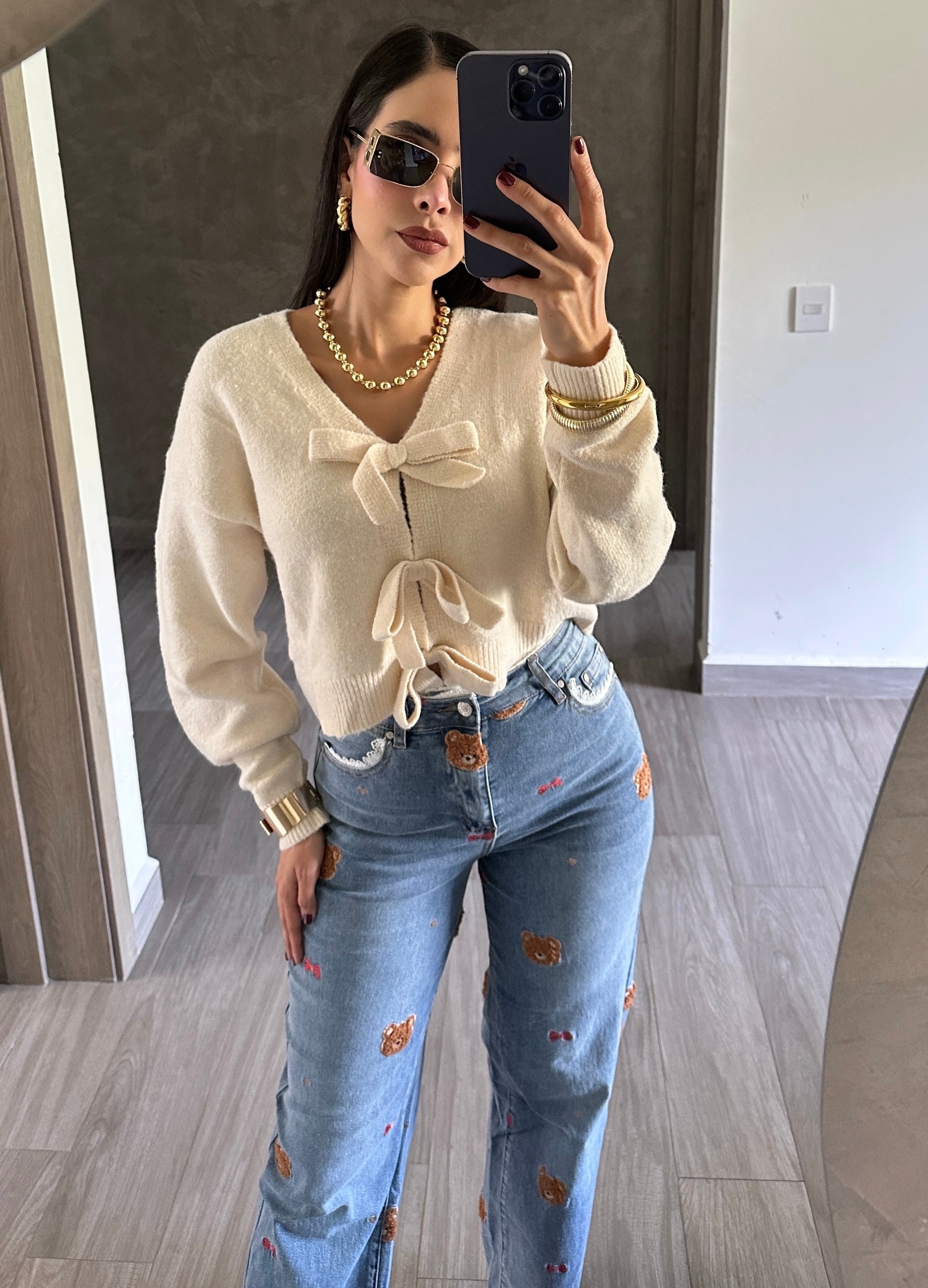 Jeans tiro alto mezclilla strech con aplicaciones de ositos.