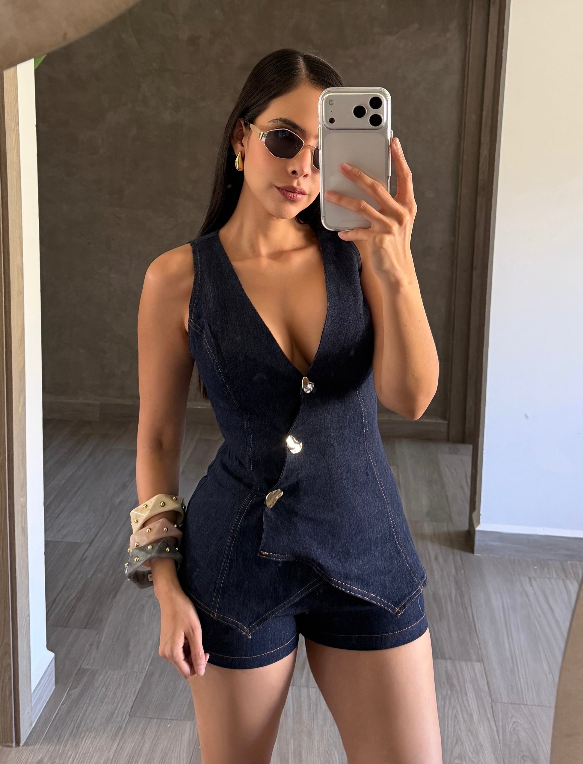 Jumper de mezclilla color azul marino con botones dorados.