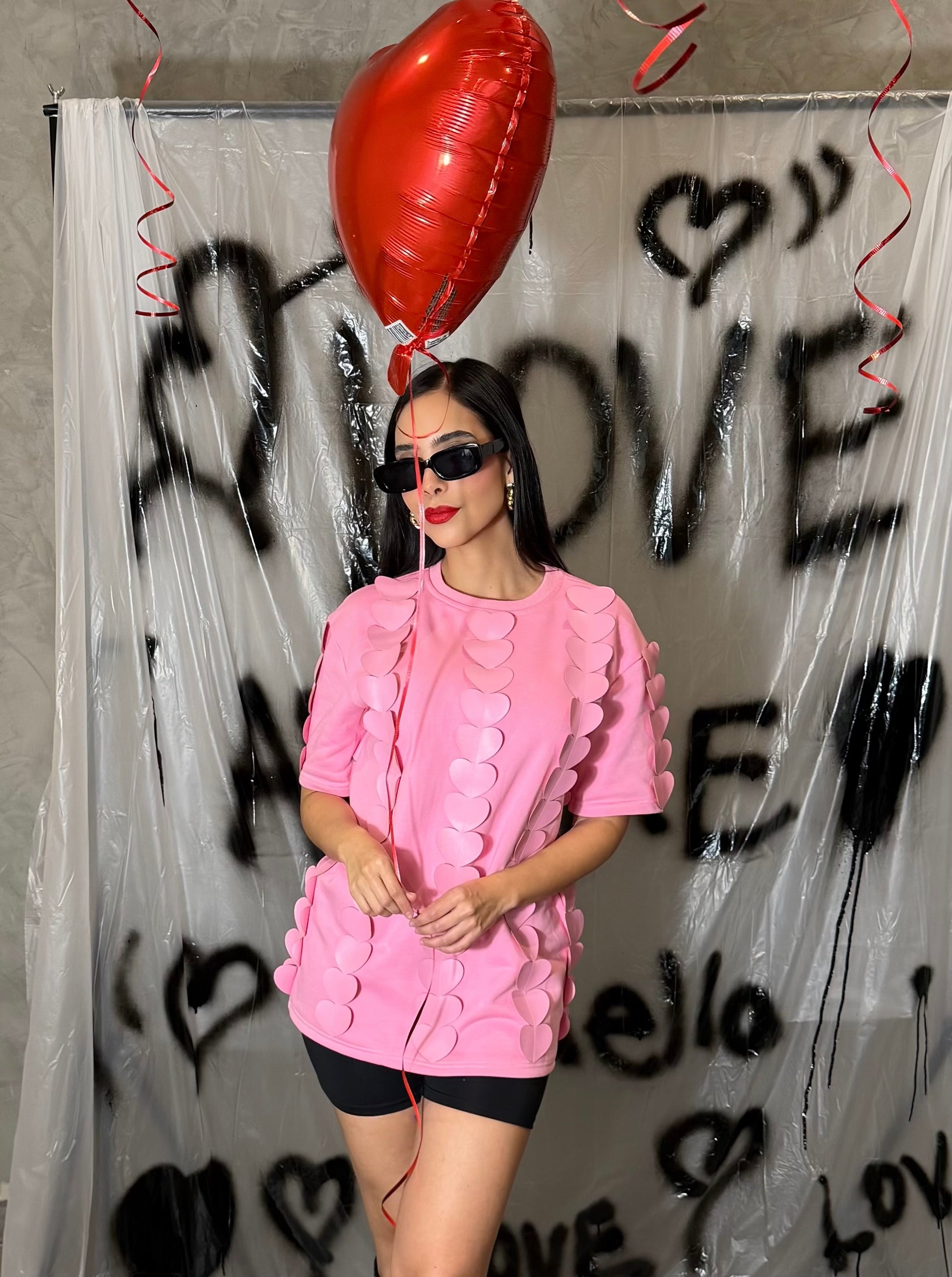 Playera color rosa estampado corazones.