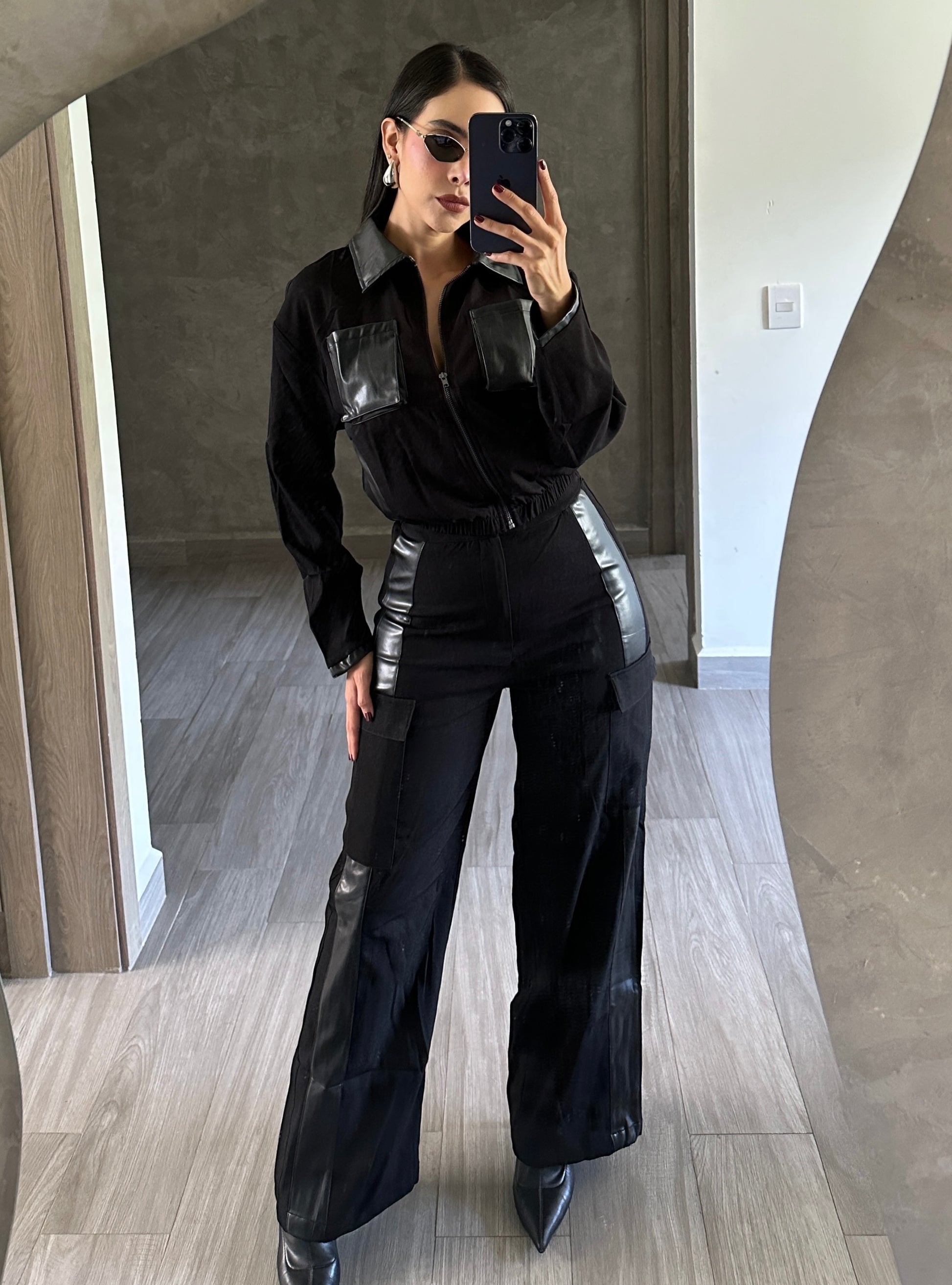 Set combinando negro con poli piel de chamarra con pantalón.